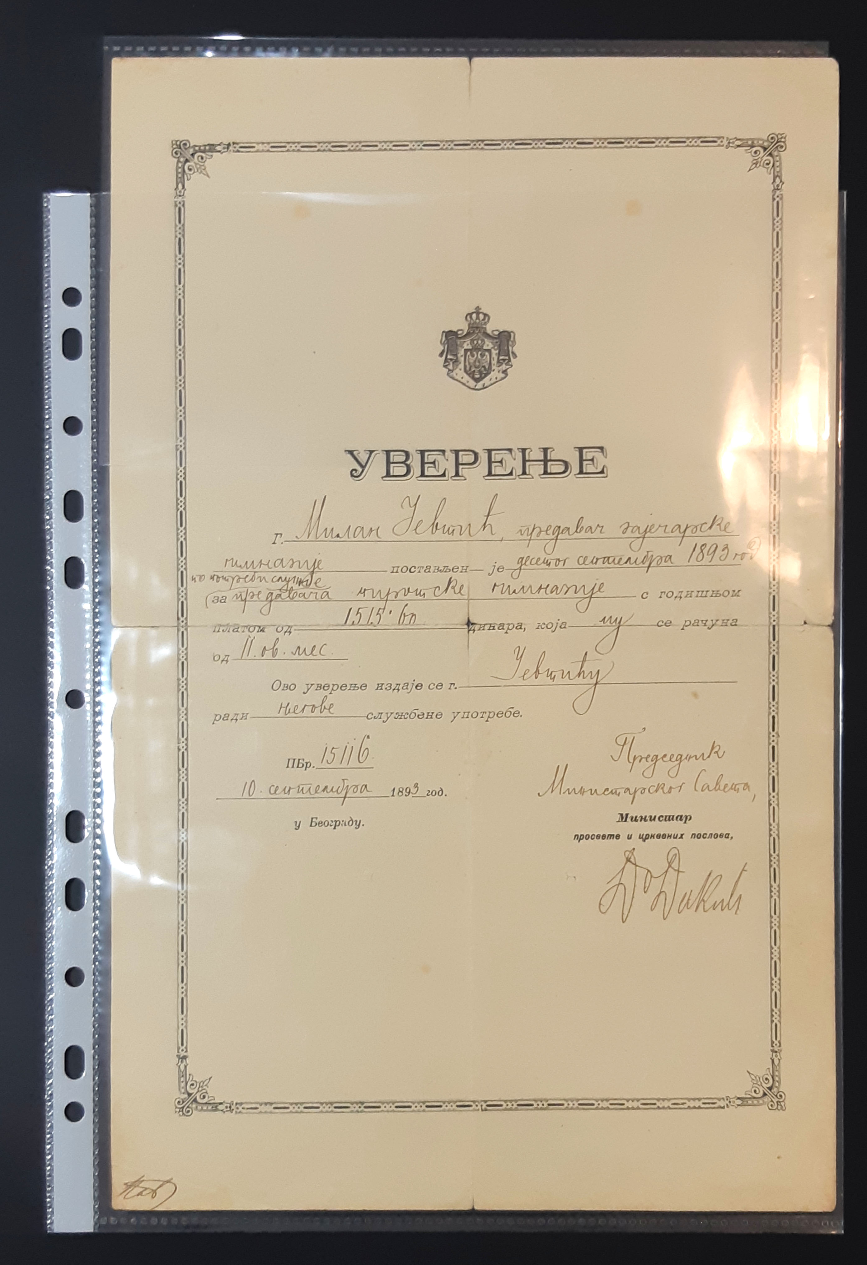 Tipski odštampan dokument o postavljanju u službu predavača Milana Jevtića u