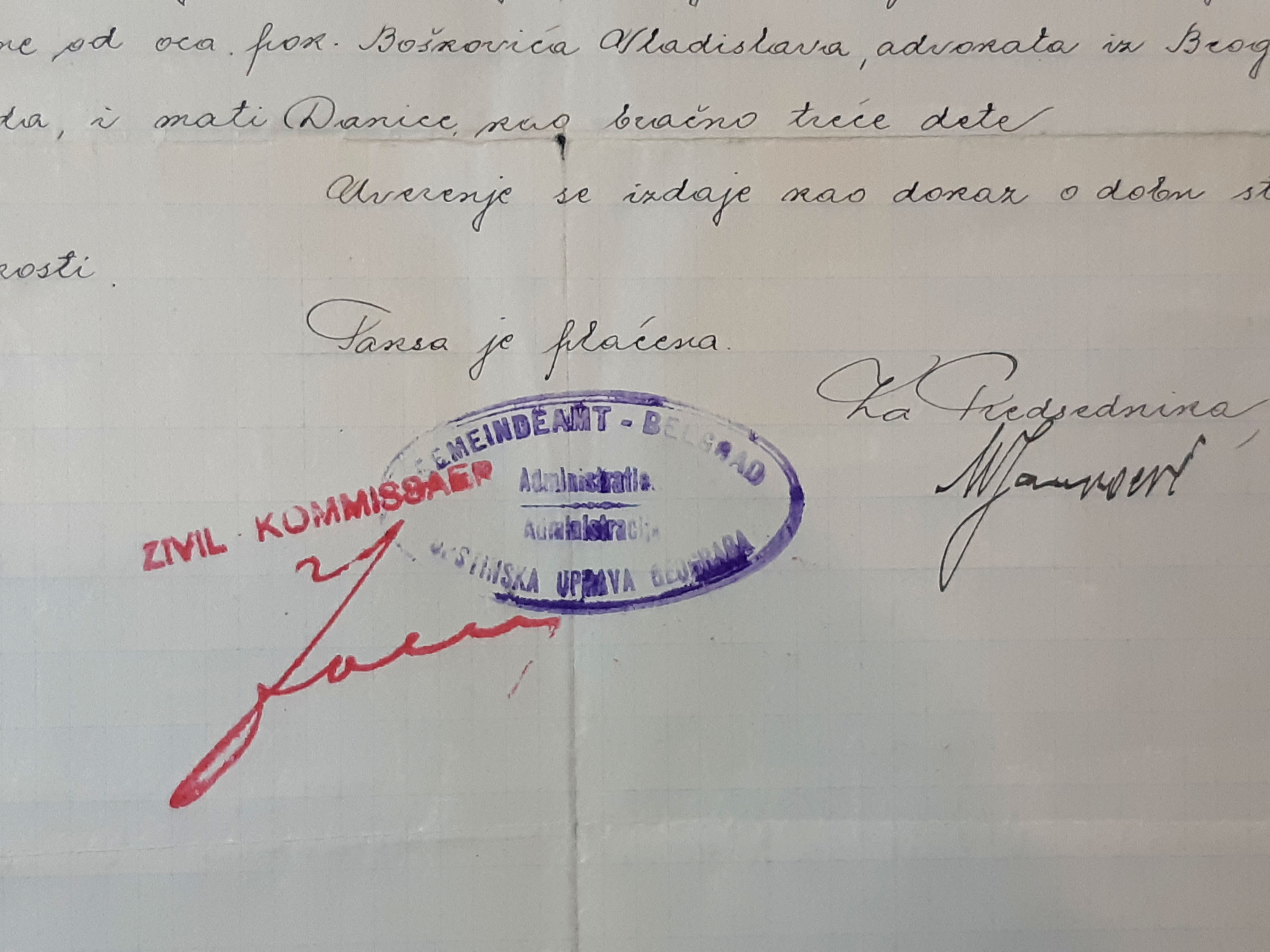 Dokument je ručno pisan, potpisani su nadležni, a na njemu su i dve vrste pečata (okupacione) opštinske uprave Beograda,